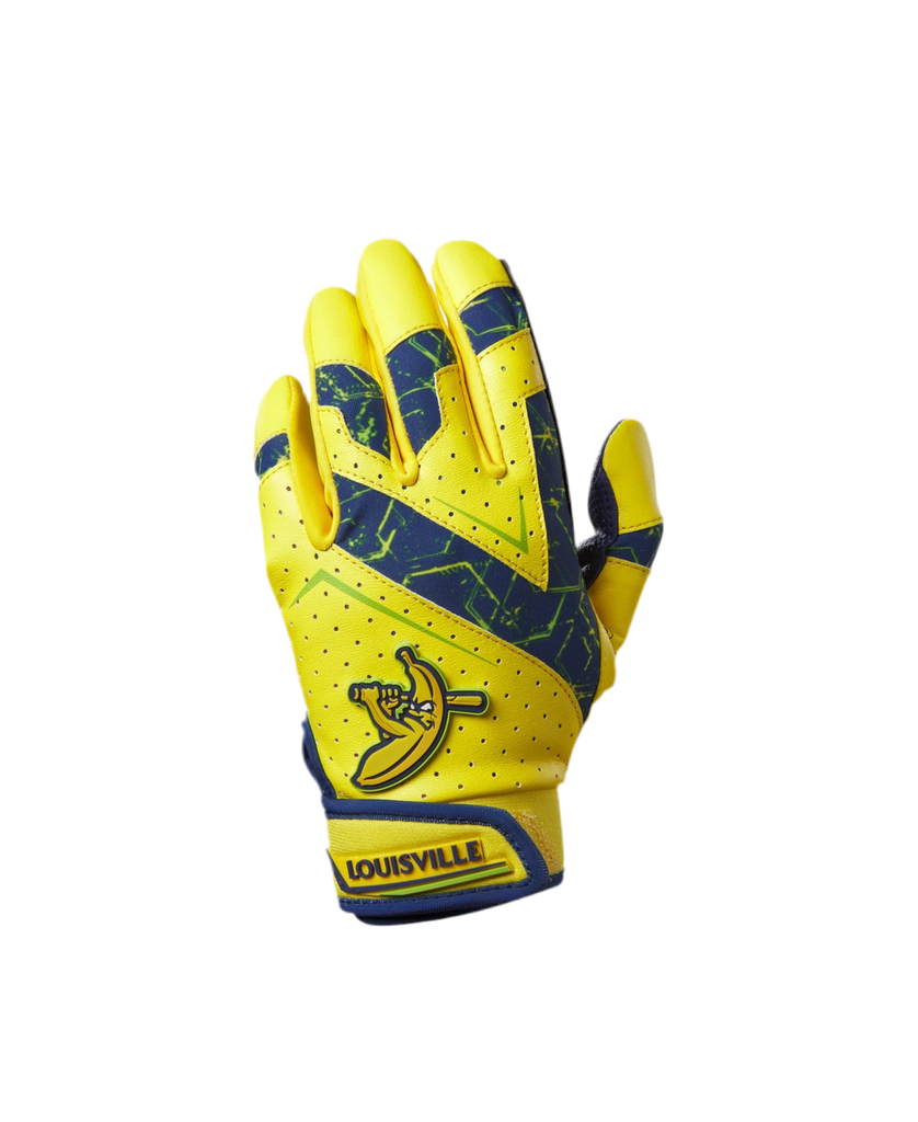 Strap in and go bananas at the plate with the Louisville Slugger Savannah Bananas Genuine V2, youth batting gloves designed by the squad making baseball fun at Historic Grayson Stadium. Engineered for the rigors of Banana Ball, these Yellow and Navy Blue baseball & softball batting gloves offer comfort and durability with a synthetic palm, perforated backhand and adjustable neoprene cuff.