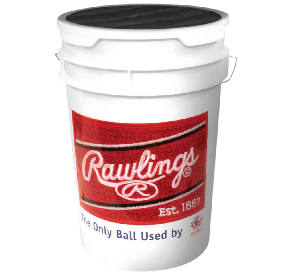 Rawlings durable bucket holds 4 dozen baseballs or 3 dozen softballs. This bucket features a snap-on lid with a cushioned seat that stays securely in place. Perfect for storing game or practice balls. White with white lid & Rawlings Logo and Baseball Canada Logo